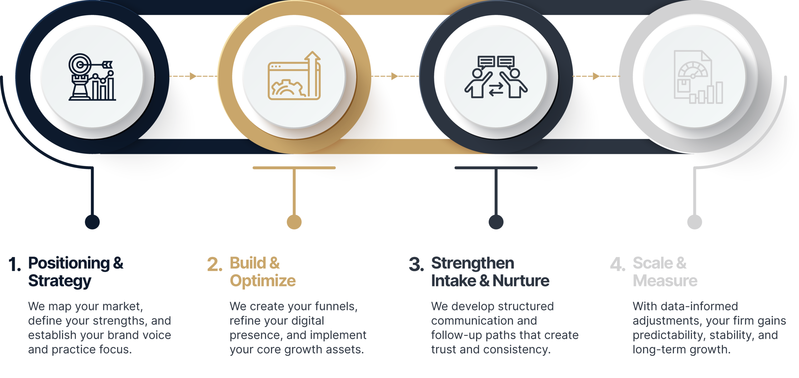 The Law Firm Growth Engine™ integrates brand positioning, digital presence, intake structure, and long-term communication to create a predictable and sustainable revenue system for modern law practices.